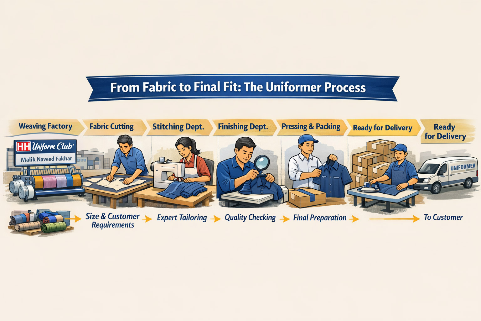 At Uniformer, every uniform begins with carefully selected fabric sourced through our strong partnerships with trusted weaving mills. We proudly work with HH Weaving Factory, Sargodha Road, Faisalabad, owned by Malik Naveed Fakhar, who also leads the renowned uniform fabric brand “Uniform Club.” This ensures consistent quality, durability, and color integrity from the very first stage.